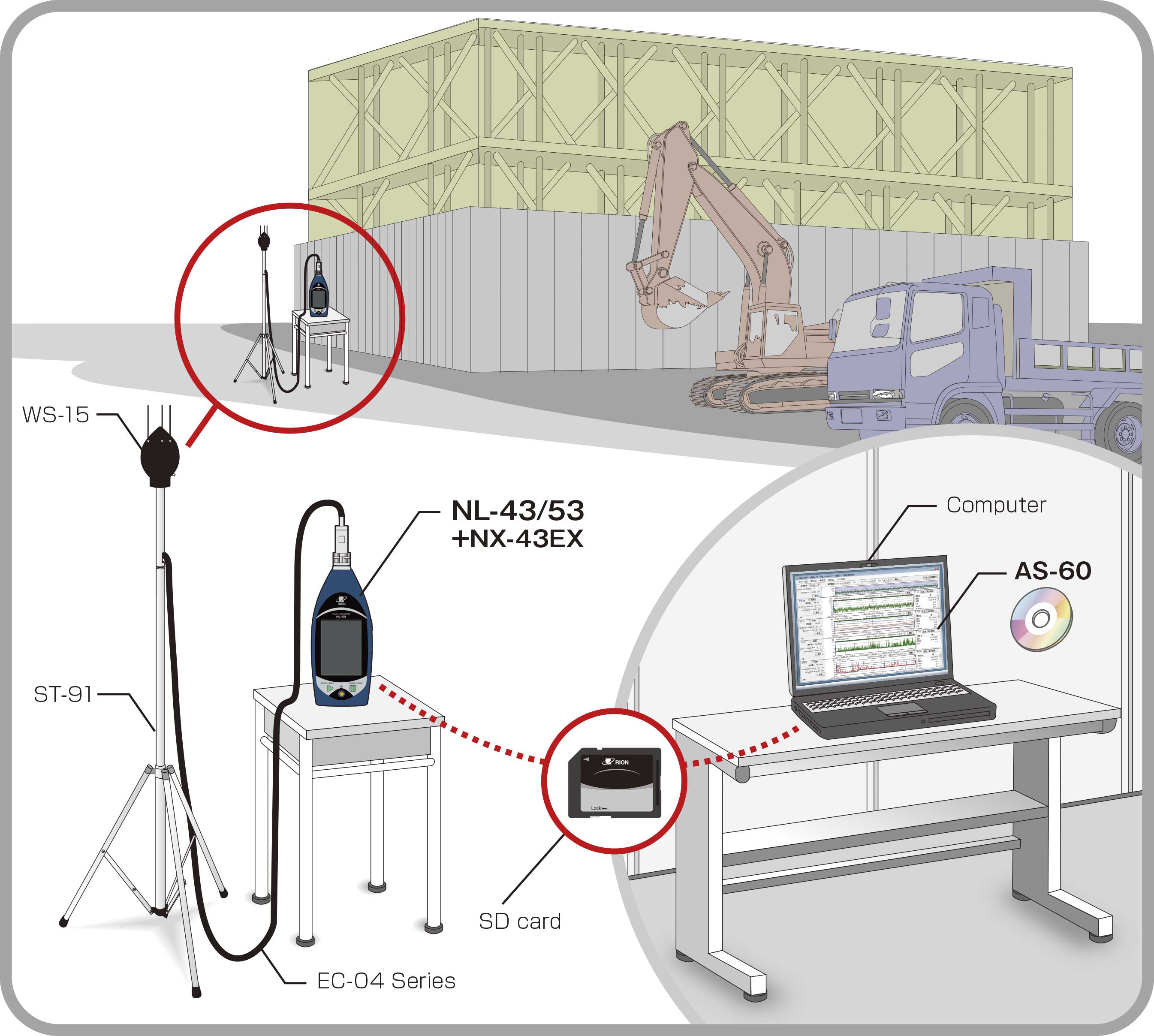 型號 產品名稱 備注 NL-53 / NL-43 精密聲學測量儀,Class 1/ 普通聲學測量儀,Class 2 NX-43EX 功能擴充軟件 WS-15 全天候防風球 WS15006 防風球安裝適配器 EC-04 系列 麥克風延長線 NE-21P AC 適配器 ST-80 / ST-91 聲學測量儀三腳架 / 全天候防風球三腳架 AS-60 環境計測數據管理軟件
