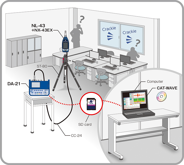 調查建筑物內產生的異常噪聲或特殊噪聲,可使用NL-43/53的交流輸出功能,將信號輸入到DA-21并記錄波形數據。如果不知道什么時候會出現噪聲,可將AC適配器連接到聲學測量儀并使用DA-21實行觸發器收錄。記錄的波形數據可以導入到FFT分析程序中進行分析頻率,并根據數據特征,發生時間帶以及其他情況綜合推測聲源。此外,波形分析軟件AS-70和波形分析軟件CAT-WAVE可以對波形數據進行二次離線分析(FFT,倍頻程分析等)。