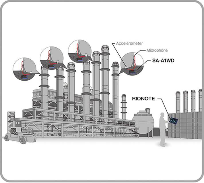 例圖,在廠區的高處設置麥克風、加速度傳感器、SA-A1WD的多個部位,使用SA-A1進行遠距離測量的示例。測量數據進行無線通信,無線電纜延長,測量系統的設置能夠簡潔化。