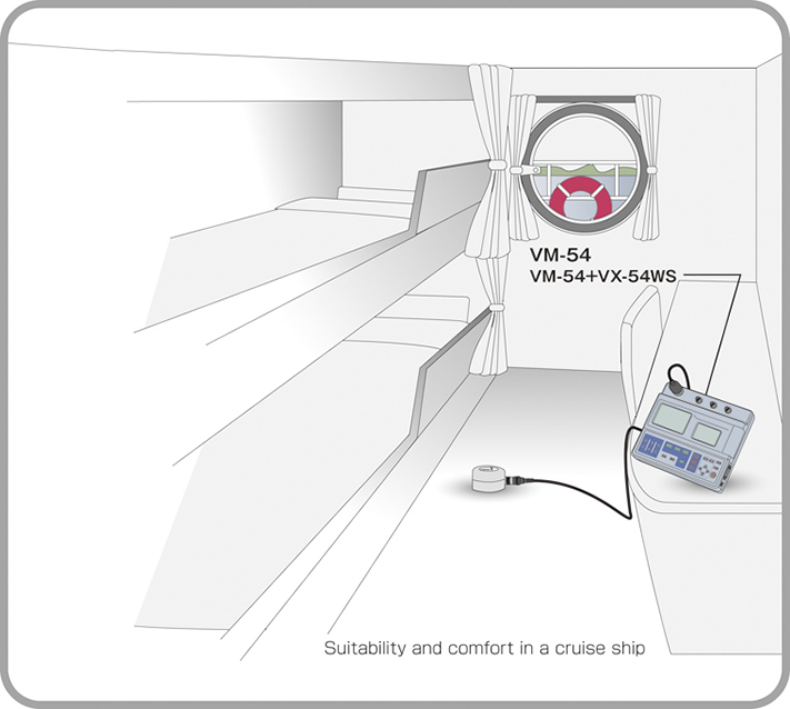 需要三軸振動測量儀VM-54和船舶振動測量卡VX-54WS來測量客船和商用船的宜居性。 船舶振動程序卡VX-54WS配有3路加速度傳感器PV-83CW用于地板。 單向加速度拾取器PV-57A可用于墻壁(選項)。船舶振動程序卡VX-54WS具有ISO 2631-2中規定的頻率加權特性Wm。 三軸振動測量儀VM-54還可以通過添加可選的FFT分析卡VX-54FT來執行FFT分析。 此外,由于配備了三個通道的交流輸出,因此可以連接到數據記錄儀和分析器。