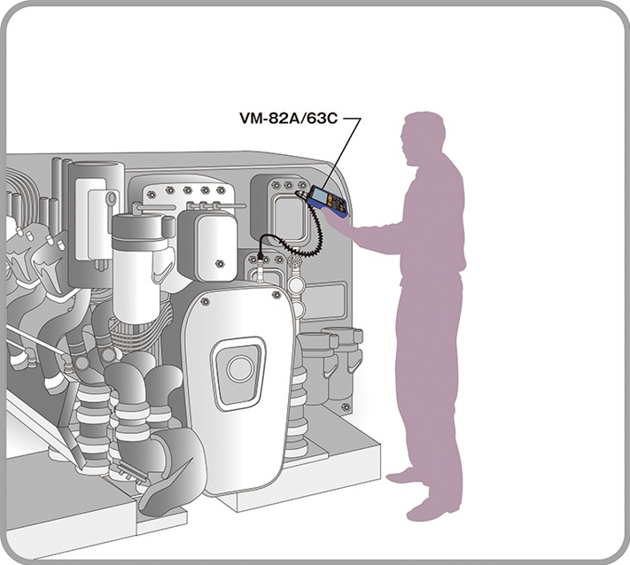 通用振動測量儀 VM-82A 或便攜式振動測量儀 VM-63C 可用于現場確認機械運轉狀態,如機械的維護管理,檢查,驗收檢查,機械設備的振動測量,定期維修后的啟動試驗,狀態監視,簡易診斷等。 使用-82A或便攜式振動測量儀VM-63C。 根據機器類型、使用目的、轉速、尺寸等選擇測量加速度,速度或位移。VM-82A 的加速度傳感器和振動測量儀本體通過螺旋線連接。加速度傳感器通過磁左或螺釘等固定到待測物體上以測量振動。VM-63C 的加速度傳感器和主機元集成在一起,在按壓到待測物體上的同時執行振動測量。