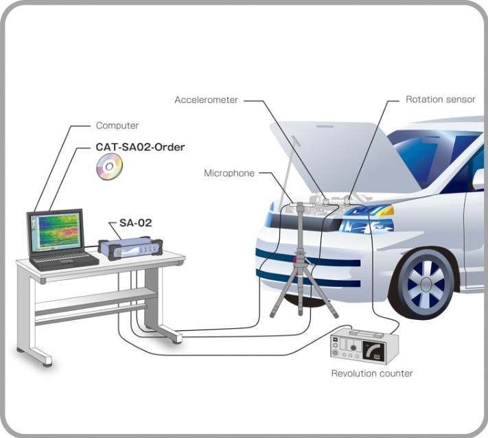 將旋轉同步信號和加速度傳感器連接到多通道分析處理器SA-02,并在改變旋速的同時進行測量。 加速度傳感器根據測量點的數量可增加或減少。 也可以使用麥克風代替加速度傳感器。
