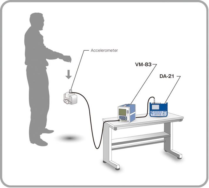 將PV-08A或PV-90B等小巧輕便的加速度傳感器安裝到測量對象上,然后將其連接到通用型振動測量儀VM-83,并在四通道數據記錄儀 DA-21 上記錄跌落加速度。