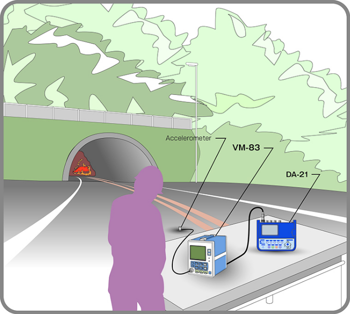 該系統用于處理振動的速度。可以將 VM-83 的AC輸出連接至 DA-21 進行記錄,并測量速度的最大值等。