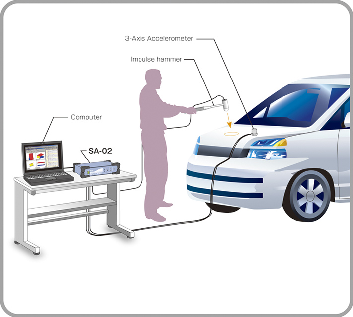 需要同時測量三個軸的傳遞函數時,也可以使用三方向加速度傳感器,脈沖錘和多通道分析處理器SA-02。