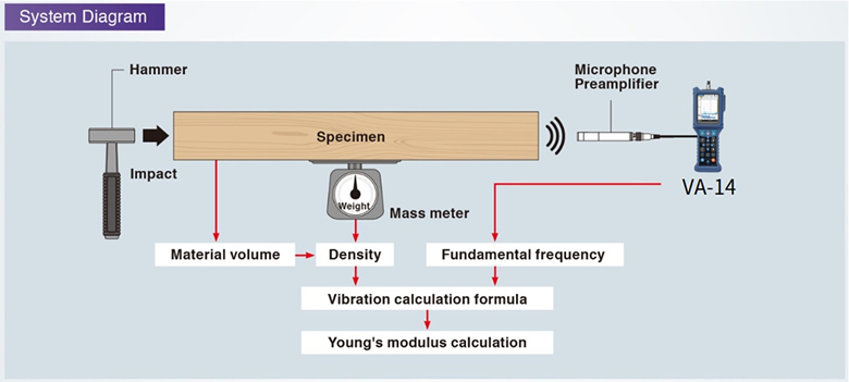 通過 VA-14 振動分析儀和麥克風(安裝 VX-14S 擴展程序)測量敲擊木材的聲音,可根據聲頻、木材體積和密度計算楊氏模量。楊氏模量是表征材料變形難易程度和剛度的指標,應用于結構分析、強度計算、特征值分析等領域。合理設定楊氏模量,能避免產品變形量和應力分布的預測與實際表現偏差過大。